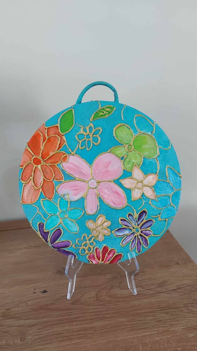 Deze drum is een kant-en-klare basis, dat wil zeggen deze is gemaakt van dierenvel/huid. Het geluid is heel anders dan mijn eigen gemaakte drums. Dit geluid is luider dan mijn eigen drums. Ook door de grootte wordt geluid harder of anders om te horen. Deze drum is door mij gedecoreerd aan beide zijden, ook weer met klei. Voorzijde tafereel is een zee aanzicht, achterzijde tafereel met bloemen in 3D. Zie onderstaande foto's.